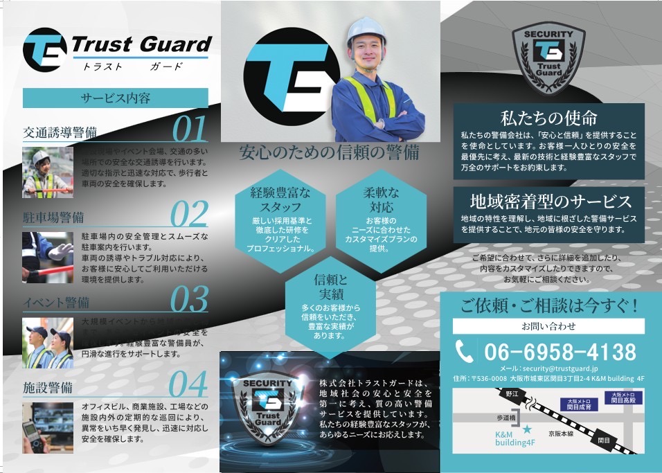 当社は、地域に根ざした警備会社として、交通誘導警備、施設警備、イベント警備のサービスを提供しています。きめ細やかで柔軟な対応を強みとし、お客様のニーズに合わせた高品質な警備サービスをお届けします。